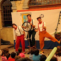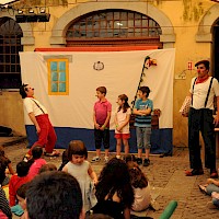 As brincadeiras de quando a rua era ponto de encontro das crianças. Tudo se passa no pátio de uma típica casa alentejana, com janela e floreira. Três amigos brincam e aprimoram habilidades circenses. A diversão culmina com a participação do público, incluindo as crianças que os “graúdos” têm dentro.