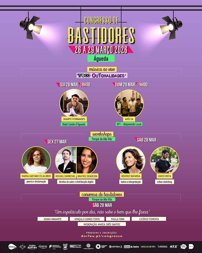 Maria Caetano Vilalobos (poesia e declamação), Miguel Carretas e Beatriz Sequeira (direitos de autor e distribuição digital), Beatriz Batarda (teatro e interpretação) e Vasco Mota (urban sketching) são os nomes que vão orientar os quatro workshops do Congresso de Bastidores 2026. Com a duração de seis horas cada, as sessões de formação decorrem entre o Salão de Chá e Café-concerto do Parque da Alta Vila. O formulário de inscrições já está disponível em dorfeu.pt/congresso e, até ao dia 13 de março, estão em vigor descontos especiais.