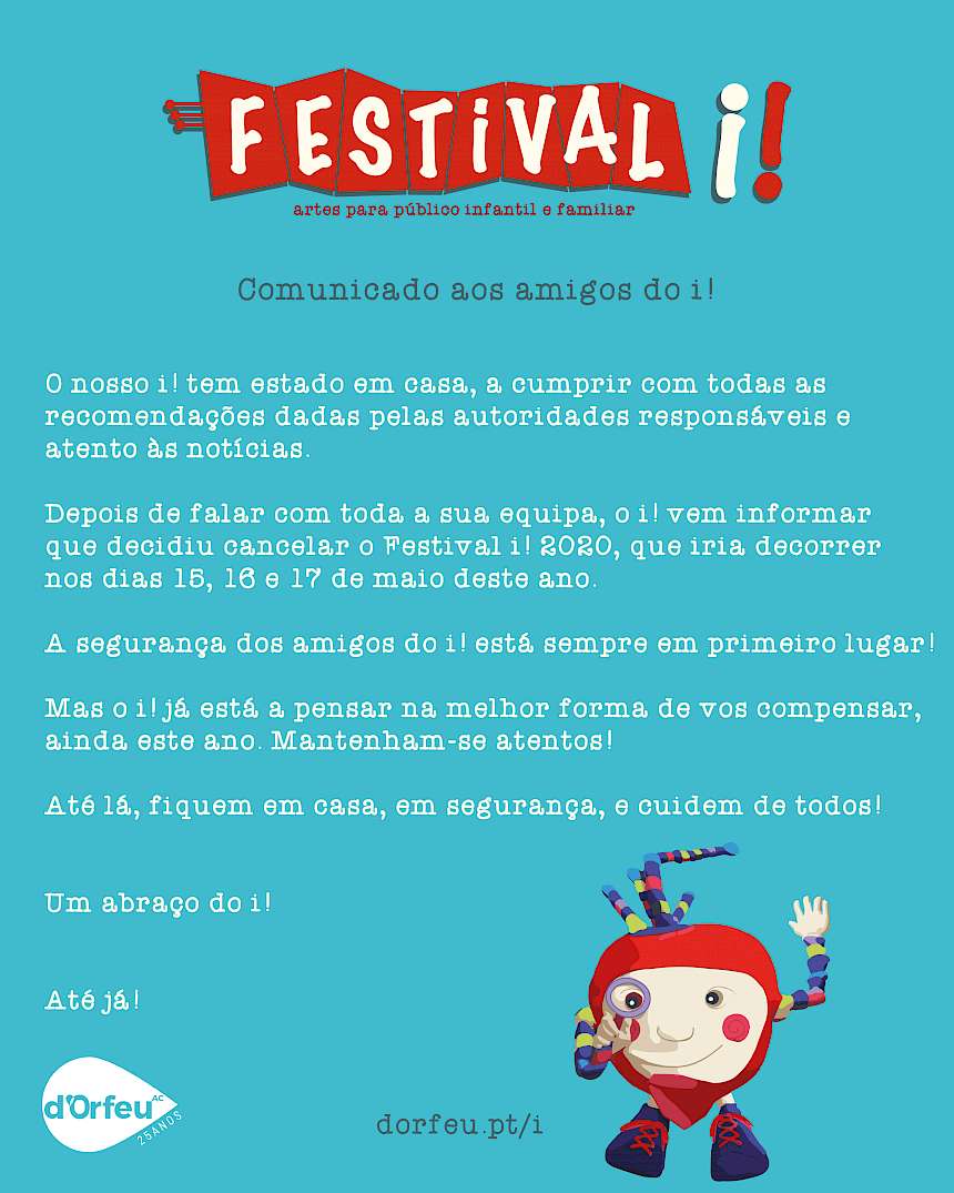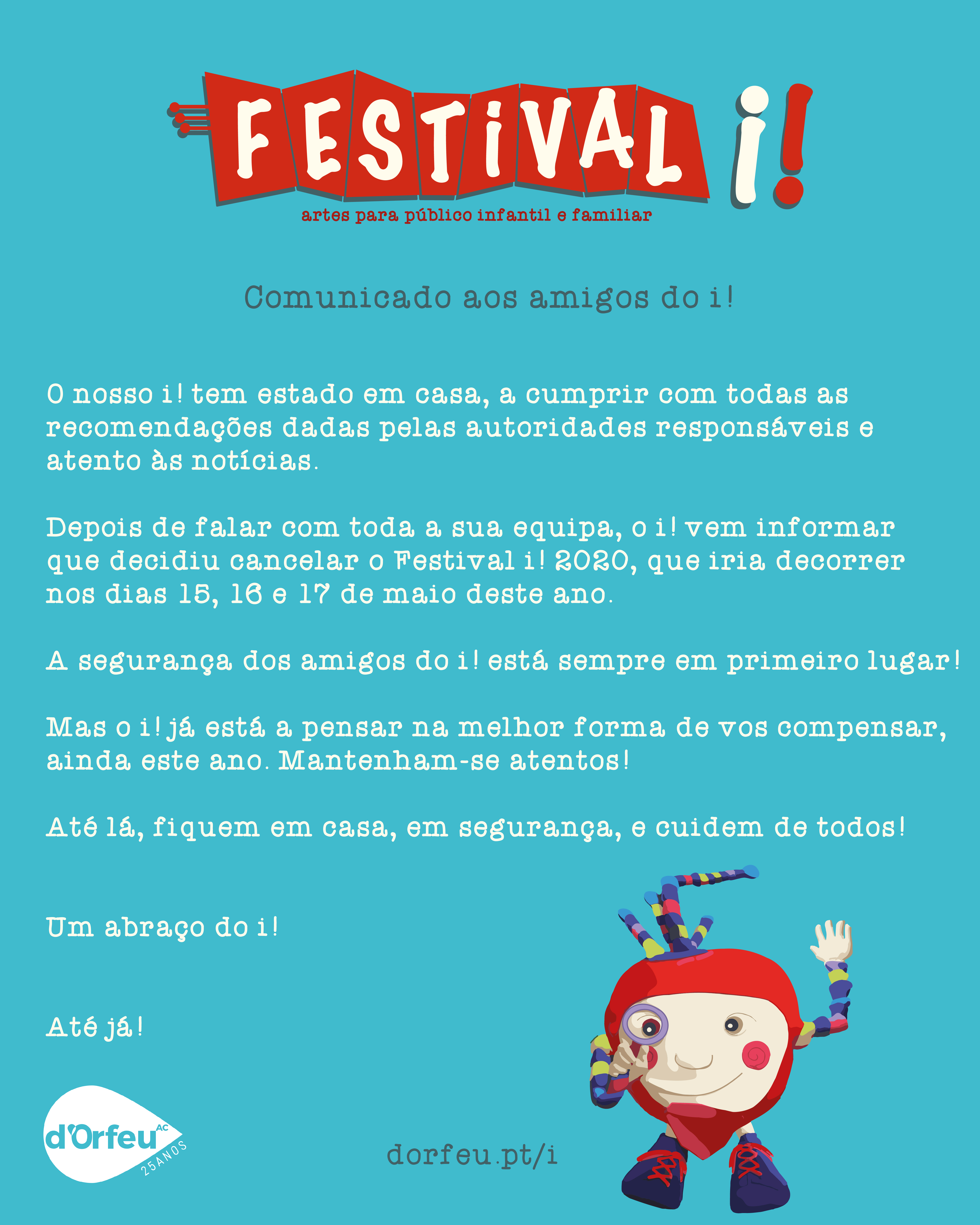 O Festival “i” ganhou lugar no calendário. Depois de ter germinado, nascido e crescido ao colo de outros festivais (“O Gesto Orelhudo” e “Solstício de Orfeu”), agora o “i” escolheu as suas próprias datas: as famílias com miudagem podem contar com o seu non-stop anual no auge da Primavera. O Festival i é um non-stop dedicado ao público infantil e familiar, com uma programação multidisciplinar que congrega teatro, música, dança, multimédia e animação, estimulando uma aproximação crítica e criativa dos públicos mais novos às artes e à cultura.